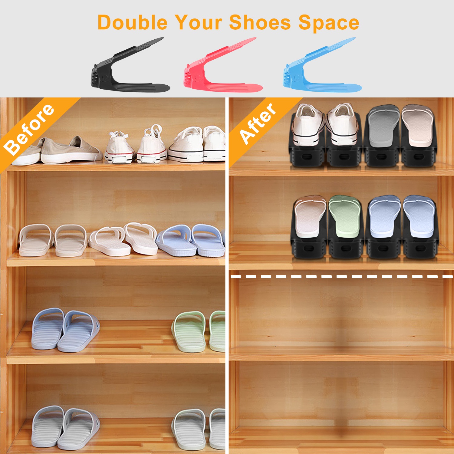Here comes a considerate design, 10 packs shoe slot organizers, to make it easier to organize kinds of shoes, also easier to take them out of closet, no more worry about shoes in mess or no enough space to store shoes. The dual-layer design holds the shoes in a vertical position, which instantly doubles your storage space & keeps your closets floors and storage areas nicely organized. Features height adjustable, it can be adjusted to accommodate every type and style of shoes including sneakers, boots, sandals, high heels, etc. Meanwhile, designed with anti-slip points on the top layer, with side & bottom buckle, which is thoughtful and great to keep the shoe from sliding off. Made of durable PP plastic, which makes 10 set of our shoe slot organizers can be used for a long time once purchased.