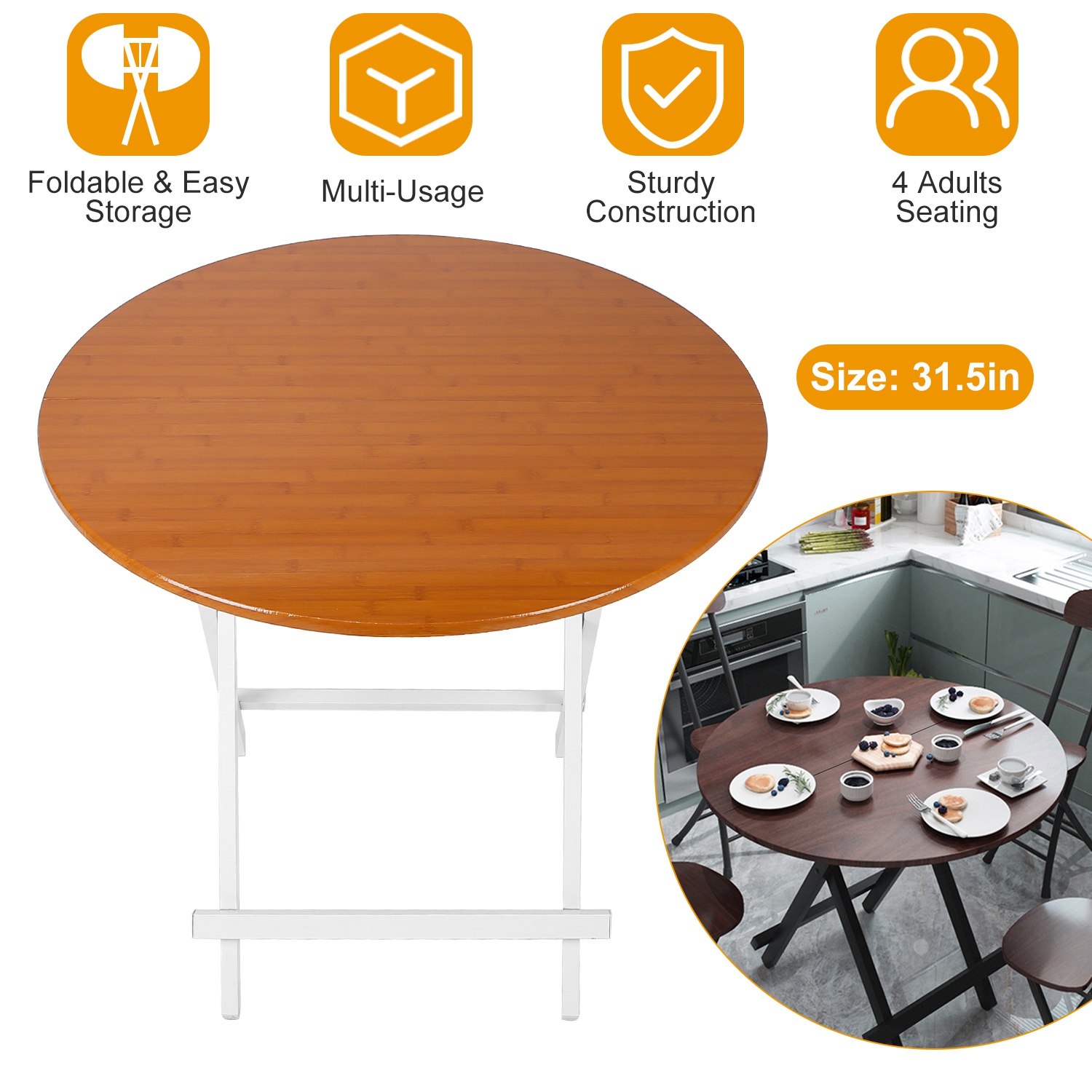 31.5in Round High Top Folding Table 2.6FT Iron Bar Foldable Wooden Dining Desk w/ 4 Anti-Slip Stoppers Bamboo Walnut For Dinner Snack Coffee Laptop