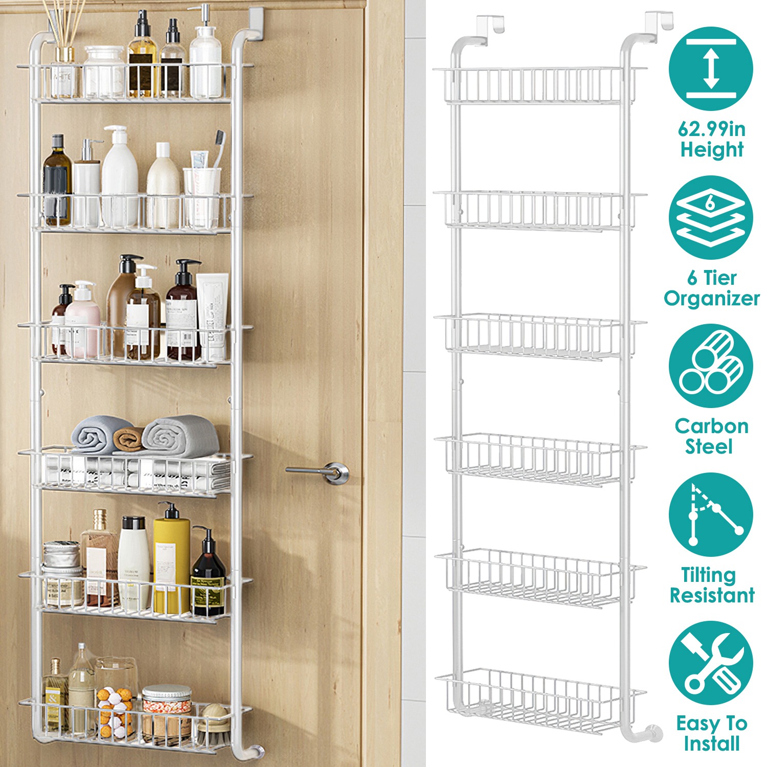 Our 6 tier over door organizer has large capacity, can be used to store cosmetics, clothes, socks, towels, toys, snacks, bottles, and baby accessories. 2 Suction cups are included to enhance stability and avoid tilting or swinging when you open and close the door. Sturdy and durable carbon steel frame has strong loading ability, each tier can bear up to 22lbs. An ideal home-organized helper to expand additional storage space.