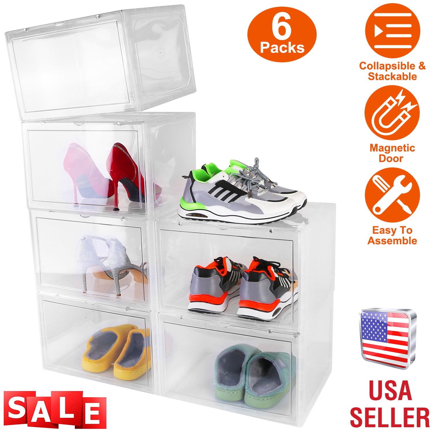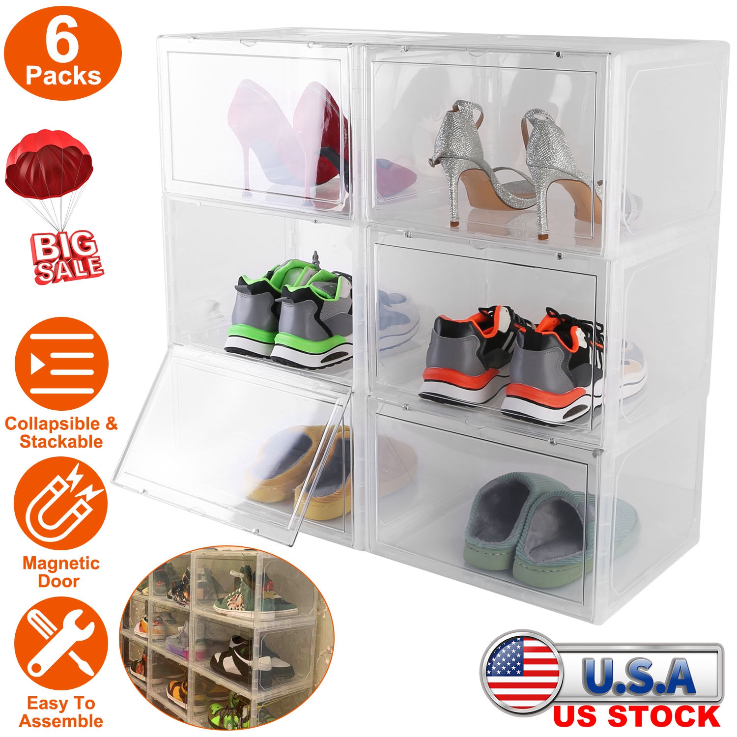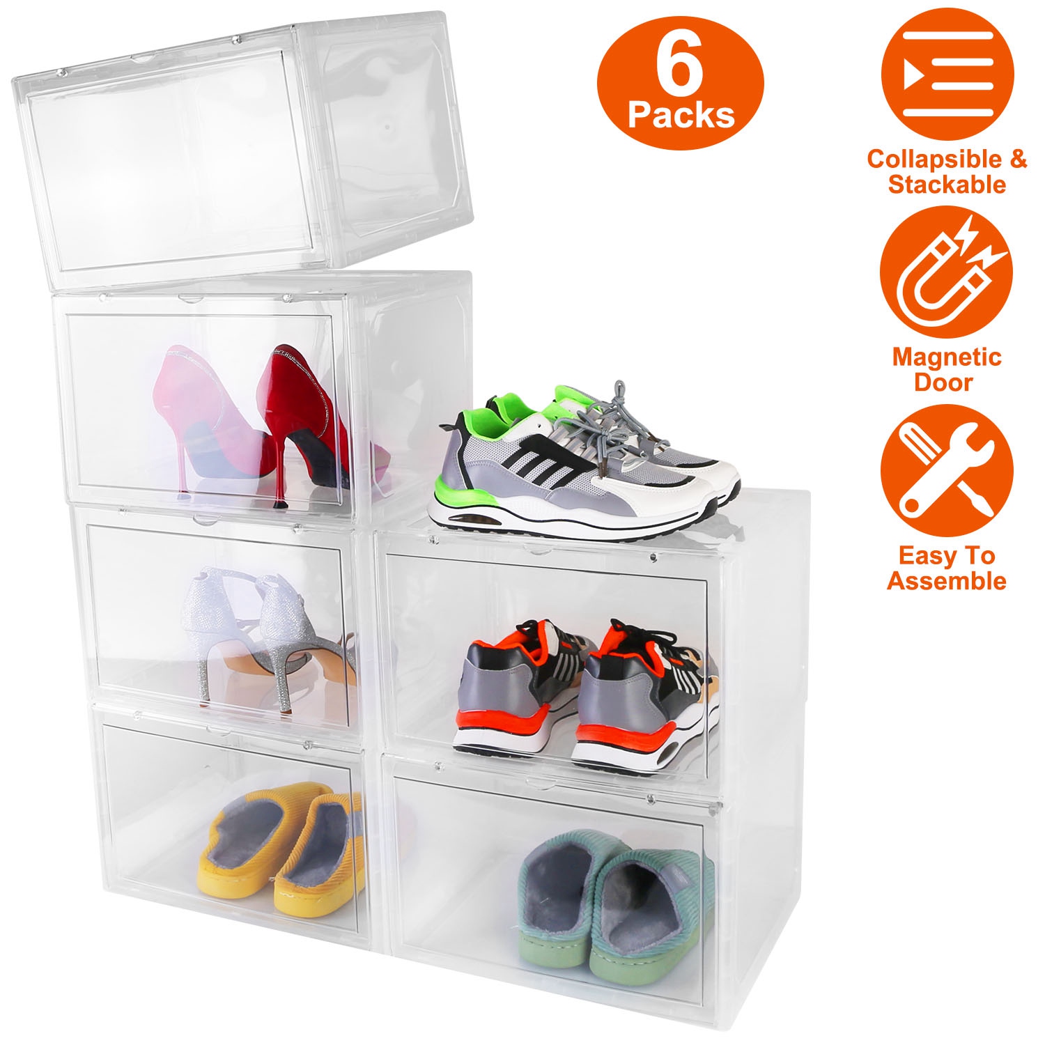 6Packs Collapsible Shoe Box Stackable Shoe Storage Bin Transparent Dustproof Hard PP Shoe Organizer Container with Magnetic Door
