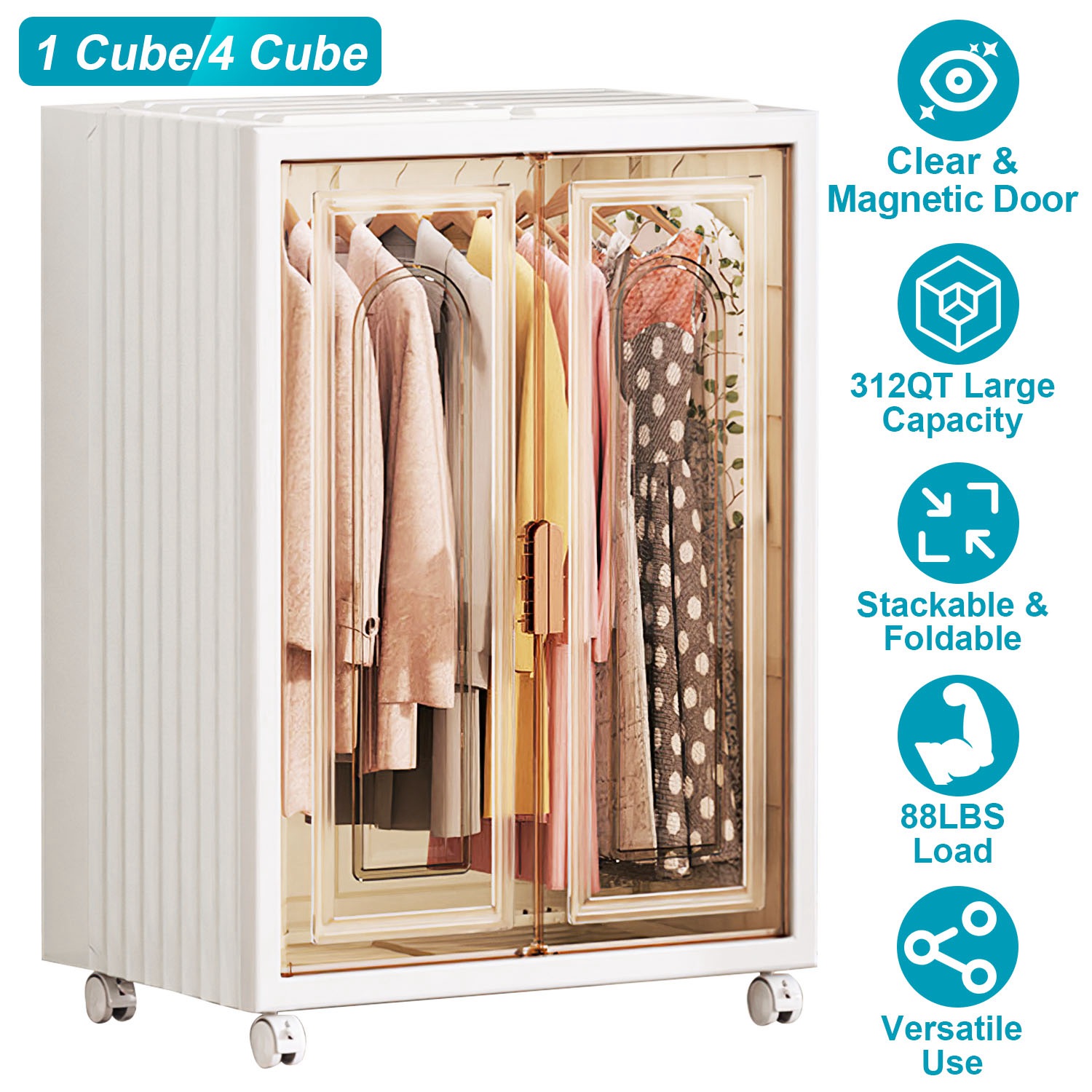 Looking for a simple closet for your baby clothes?Our small storage cabinet boasts 312QT large space and 88LBS weight capacity that are able to store clothing, toys, books, bedding, snacks, drinks, tools and more. Offers 2 options, 1 Cube and 4 Cube. 1 Cube Closet is suitable for hanging summer clothes or storing folded clothes. 4 Cube Closet contains 4 compartment with different sizes, which enables you to categorize different clothes, such as 1 big compartment for hanging your daily wearing, 3 small compartment for underwear, towels, skincare products etc.. Clear and magnetic doors ensures quick access for clothes. You can move this closet anywhere you want with 4 flexible wheels, 2 of them lockable for stability. Easy to fold it down when not in use. Stackable for more storage possibilities. An ideal large capacity storage bin in home!