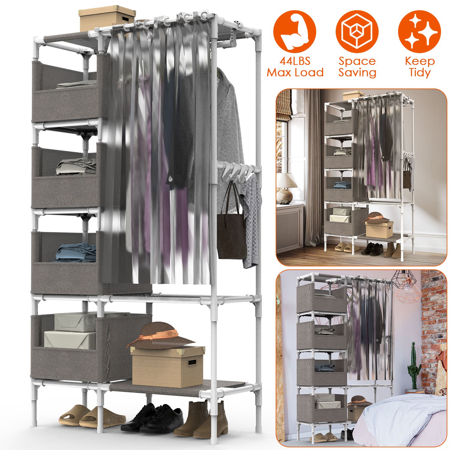 Are you bothered and need a simple closet wardrobe to tidy up your clothes quickly It is optimal for laundry room, bedroom, and other small room. Designed with 4 storage bag compartments that are great for your bags, plush toys, 1 bottom shelf for your daily shoes, 1 hanger rod for your coats, dresses, and 4 hooks for your ties, shawls, caps and more. A must-have to keep your room neat and orderly. Non-woven fabric and curtain design are great to prevent dust and add much elegance to your room. Durable steel tube and plastic connector make it able to hold up to lbs. Easy to install with your bare hand, other tools needed.