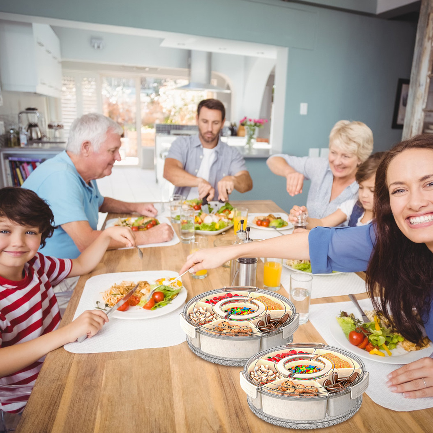 Perfect for storing snacks, fruits, nuts, candies, and even salads, our divided serving tray is designed to keep your snacks and fruits neatly sorted while preventing any unwanted mixing of flavors. Sealed lid with silicone circle and secure latches helps maintain freshness and cleanliness of food. And hidden handle ensures convenient portability wherever you go. 360° rotatable base makes serving yourself and your guests much easier than ever before. Whether you're camping, hosting a party, enjoying a picnic, or having a family movie night, our divided snack box containers is your best choice!