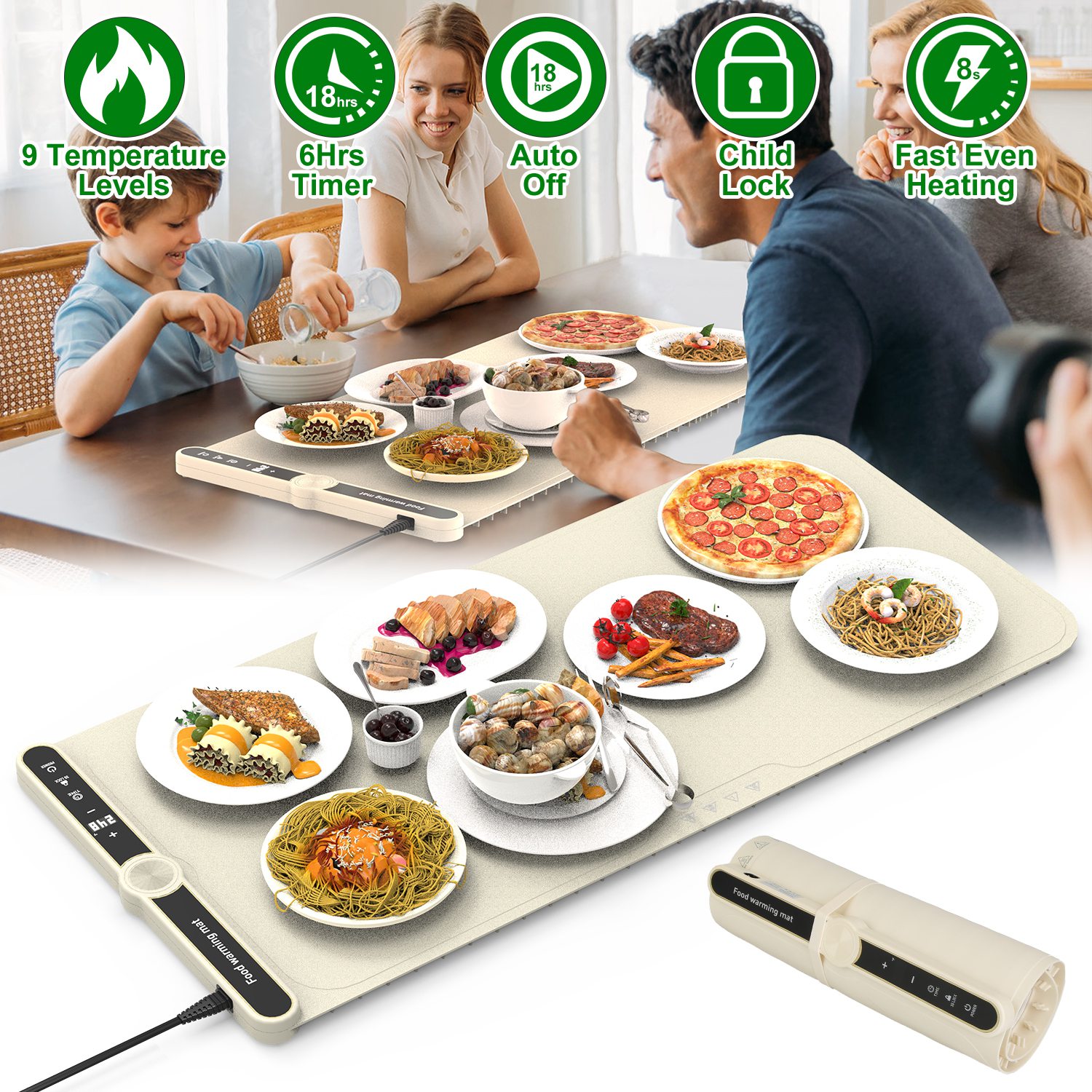 Silicone Food Warming Mat With 9 Temperature Levels 6Hrs Timer Child Lock Auto Shut Off Roll-Up Electric Warming Tray For Party Buffet Gathering Daily
