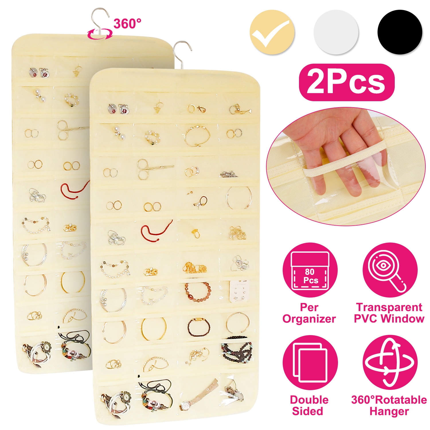 2Pcs Hanging Jewelry Organizer Earring Necklace Bracelet Holder Double-sided 80 Pockets Accessory Storage Pocket