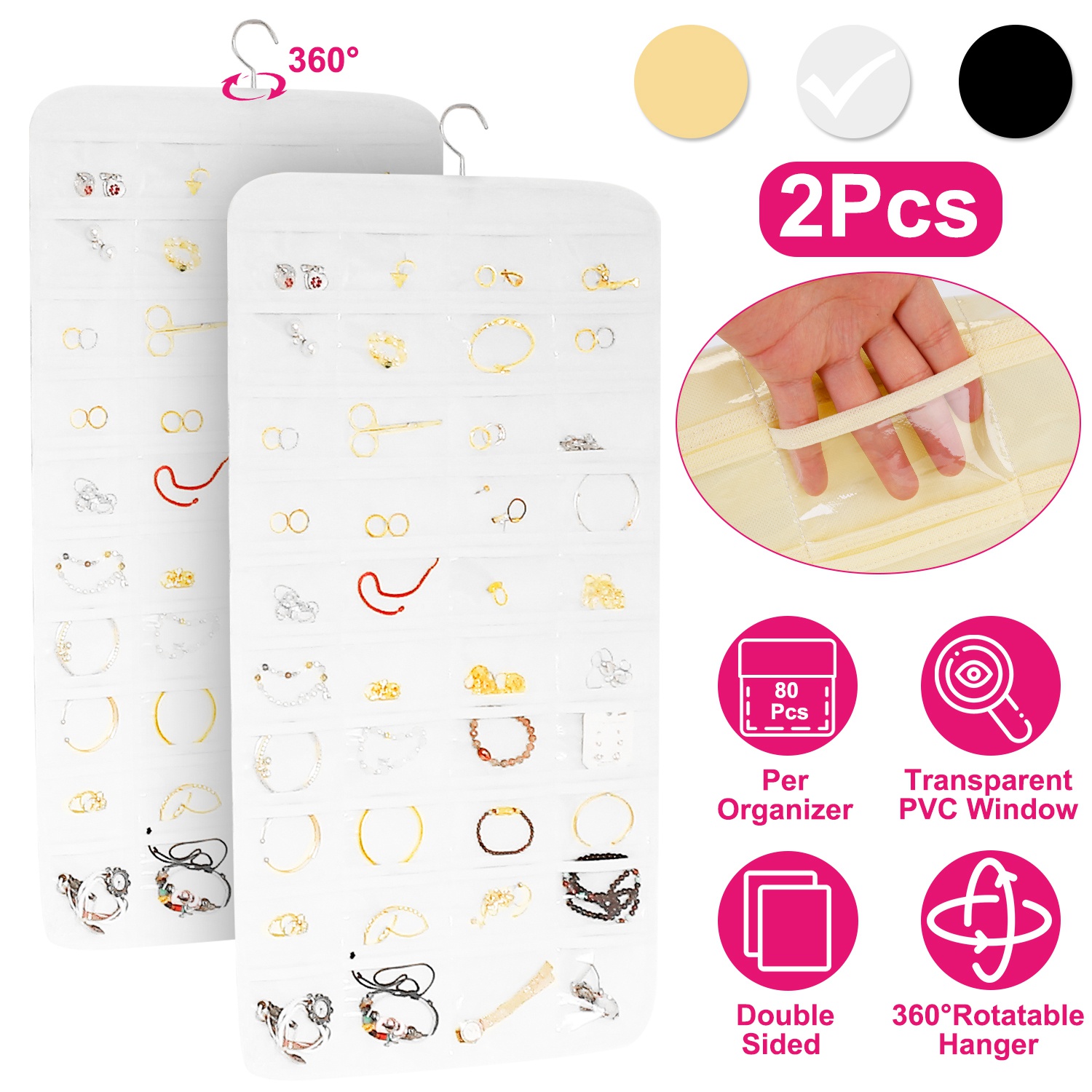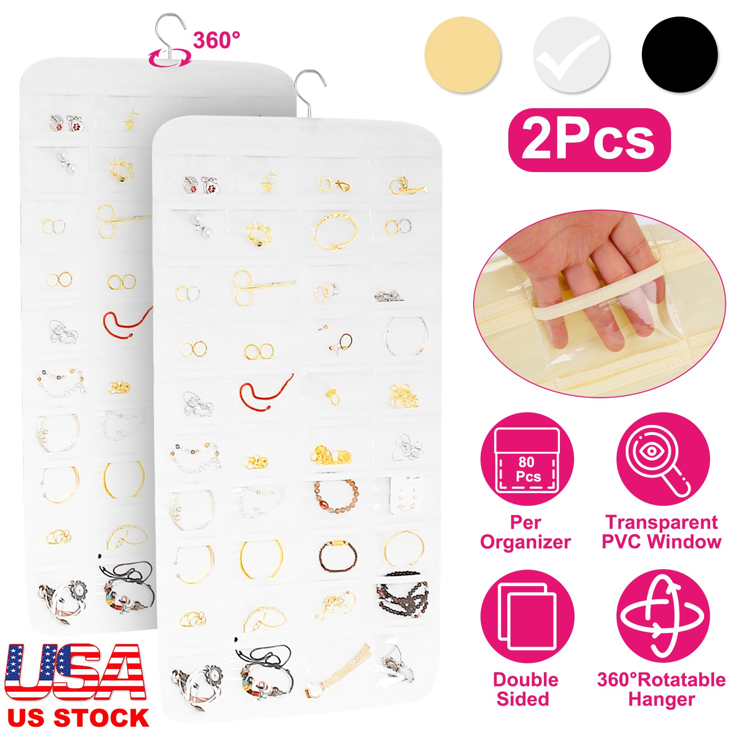 2Pcs Hanging Jewelry Organizer Earring Necklace Bracelet Holder Double-sided 80 Pockets Accessory Storage Pocket