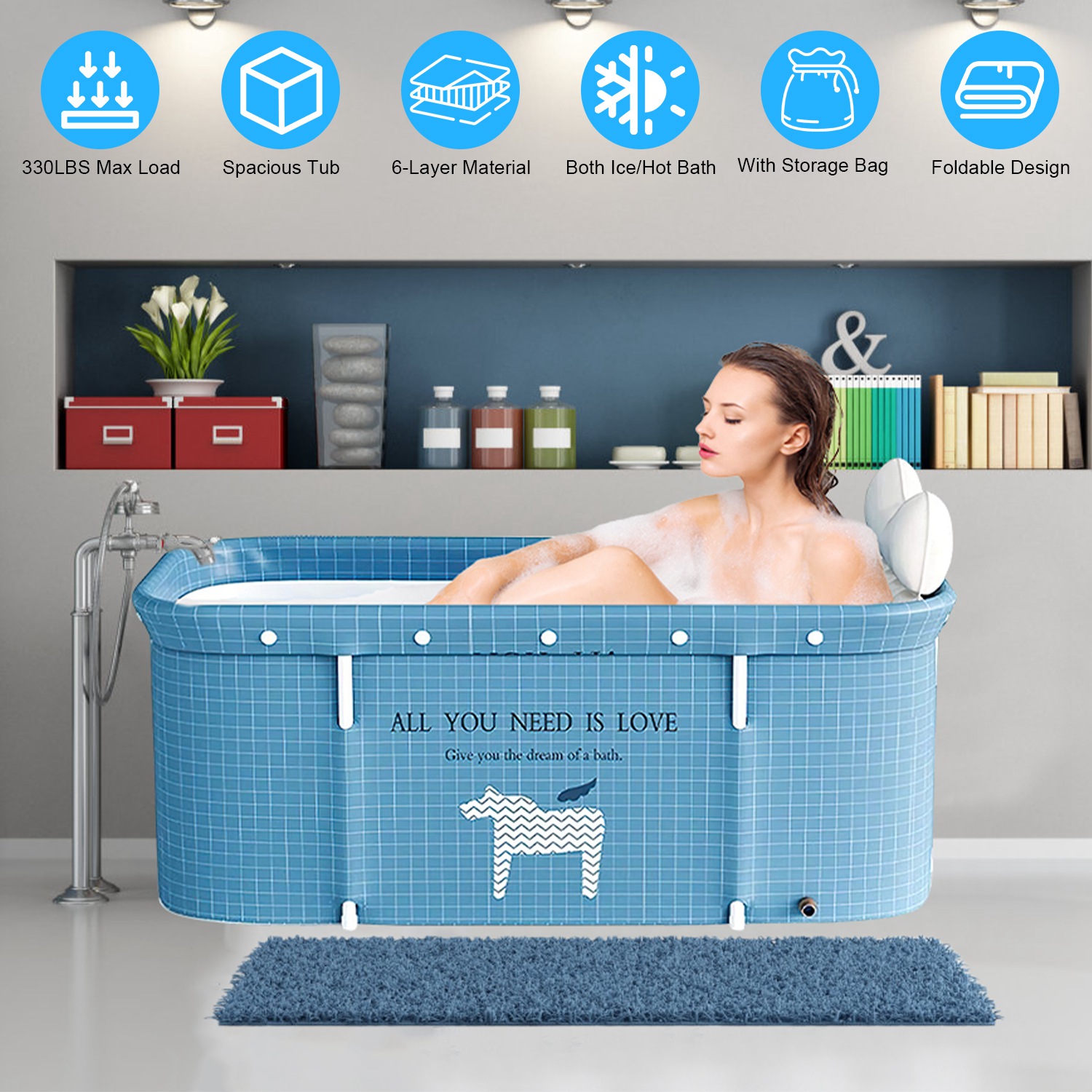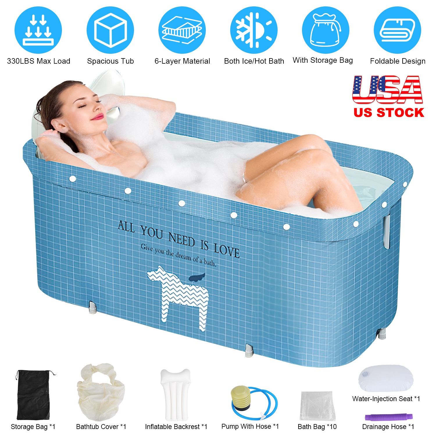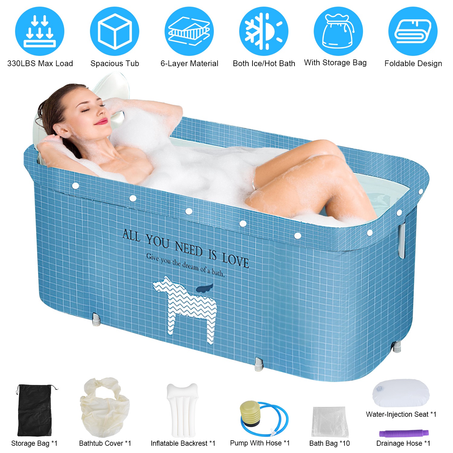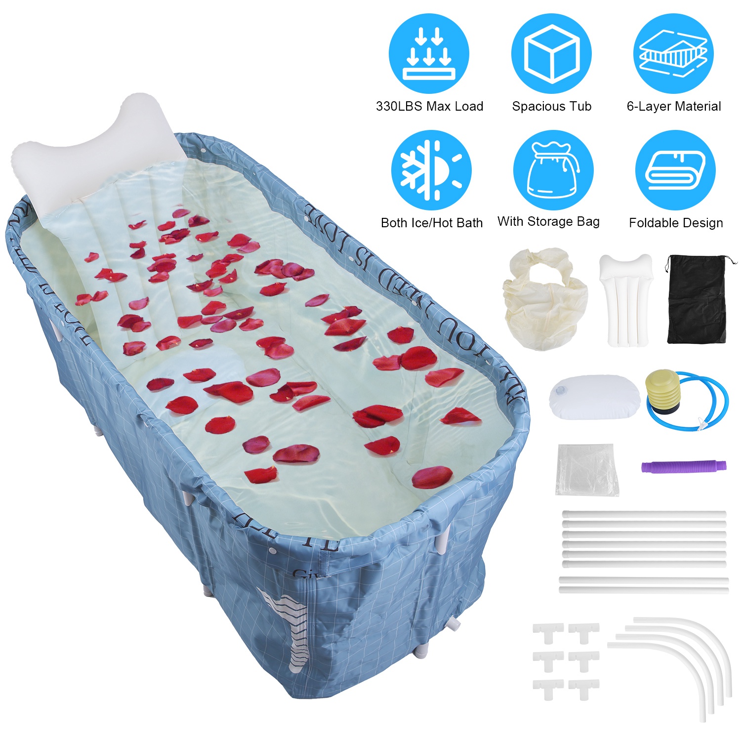 It's essential to relax yourself after daily hard work. Taking a bath in a bathtub is an effective way to reduce your fatigue. With extended size of 47.24x21.65x19.7in, the soaking tub provides you with comfortable stretching space without restriction. Able to withstand up to 330lbs, you can also bath with your family. 6-Layer material makes it great to keep warm/cold, so that you can enjoy an ice bath after sports, or take a hot bath in the cold season. We provide you with an extra inflatable backrest and a water seat, rendering you a maximum comfort. The tub bag makes you no need to clean the bathtub, saving you precious time. When you want to take a spa bathing, the included bath cover ensures an excellent experience.