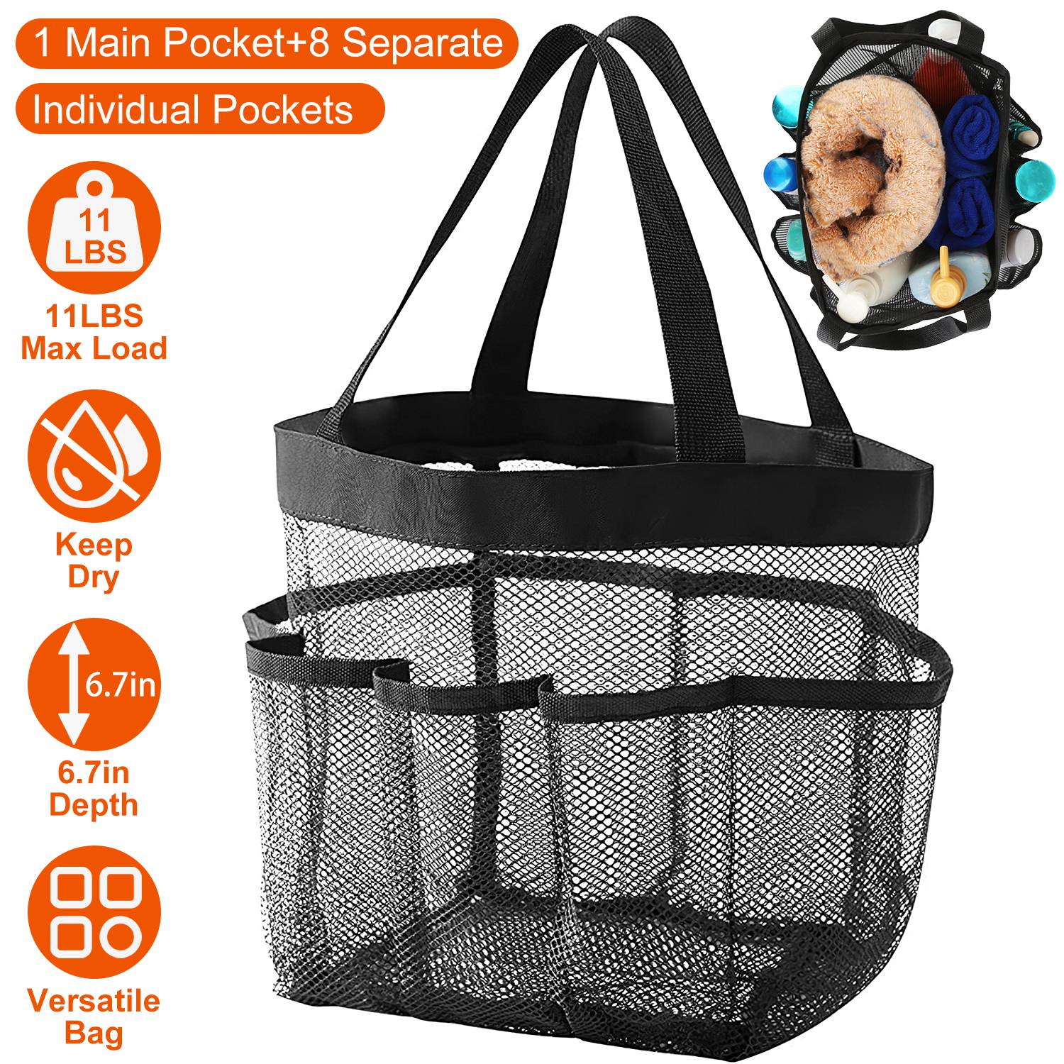 Our versatile bag can be used as shower bag, bath toy net, diaper bag, storage organizer, shopping bag, eco bag, travel bag, portable beach bag, and etc.. It can be used in college, dorm, camp, travel, gym, swimming, bathroom, toiletry, cleaning supplies, beach, school, picnic, shopping, pool, and etc.. Featured with premium materials, sturdy handles, quick dry mesh bottom, not easy to tear bottom, reinforced edge, all these features render long lasting use of tote bag. 6.7in Tall pocket prevents the bathroom necessities from falling off. Stylish black color is well matching your clothes of more styles.