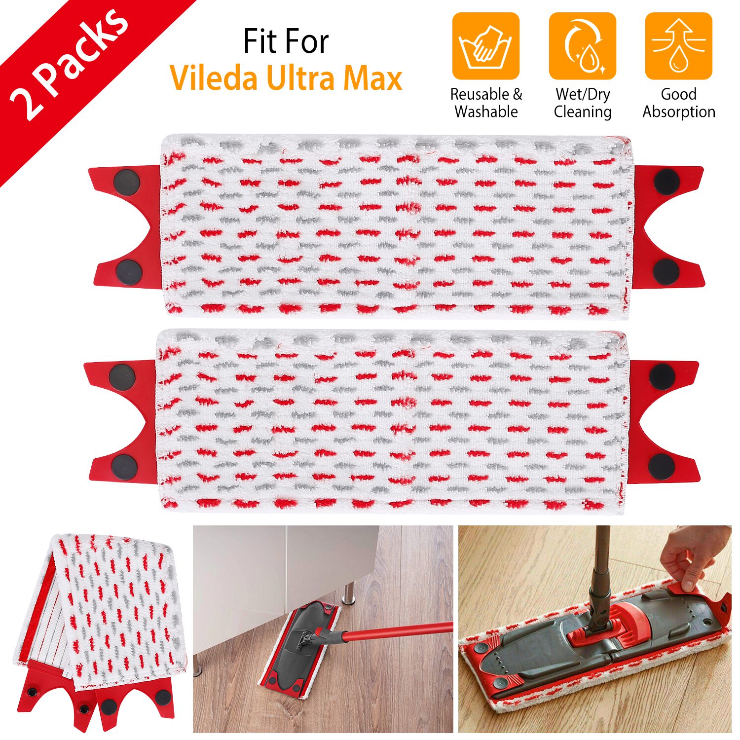 Come with 2 packs replacement mop pads, allows for convenient replacement. Adopt premium fiber, can easily capture wet or dry dirt and absorb pet fur, hair, debris, dust, oil or other stubborn stain, durable and reusable. Good absorption helps the floor dry faster. Suitable for most smooth floors, such as vinyl floors, wooden floor, glass windows, cars, etc..