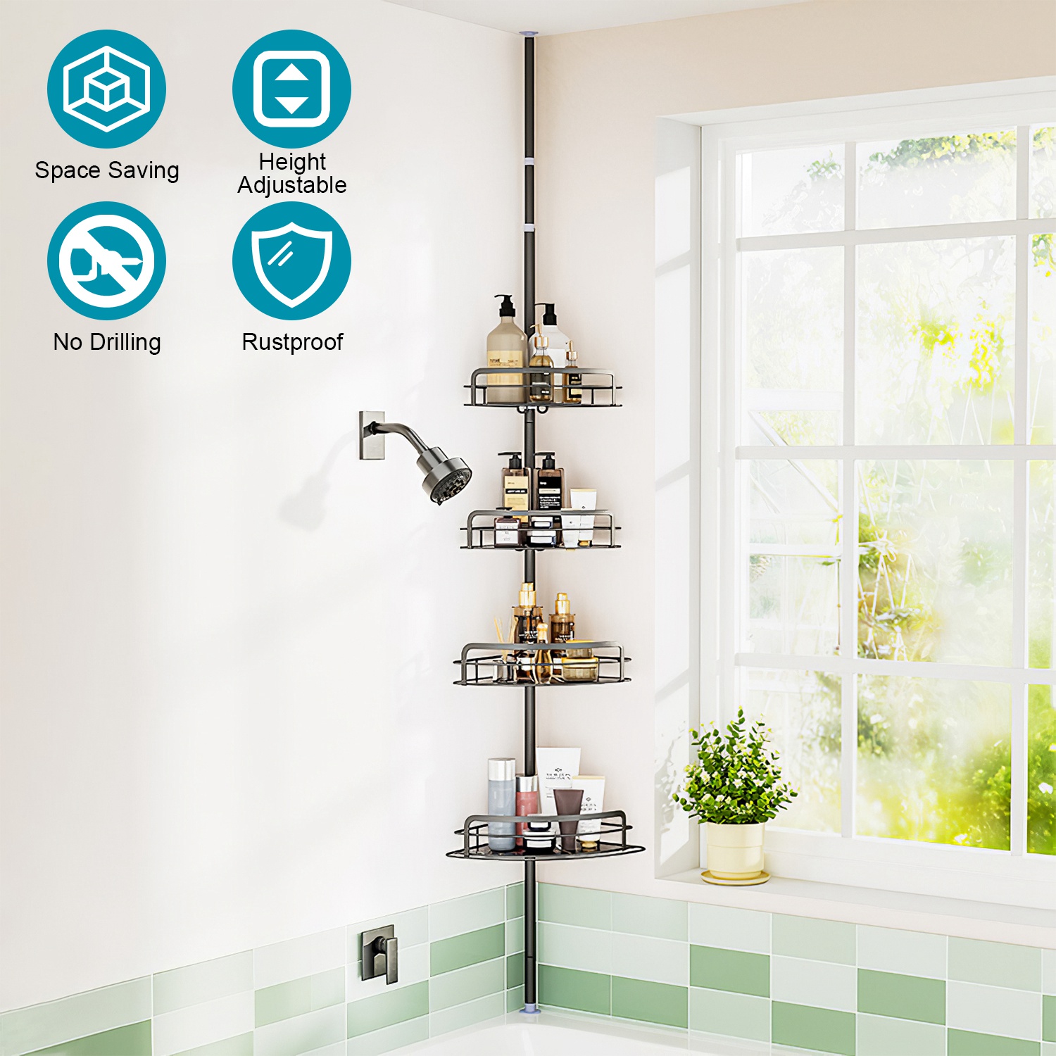 Home > Rust-Resistant Corner Shower Caddy For Bathroom 4 Height Adjustable Shelves With Tension Pole Towel Bar Hanging Hook Floor Standing Bath Storage Rack