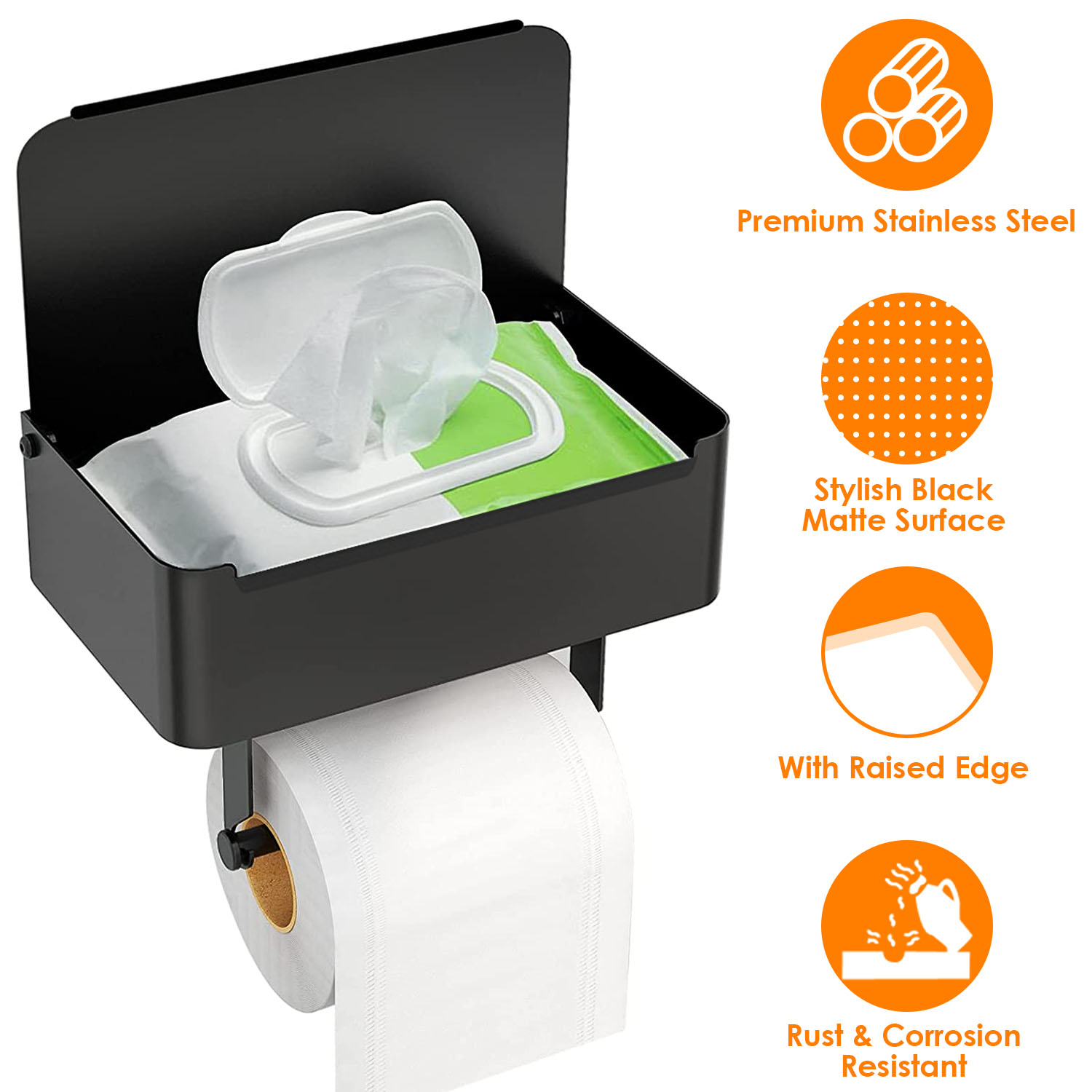 Toilet Paper Holder with Flushable Wipes Dispenser Wall Mount Stainless Steel Matte Black Toilet Paper Holder with Shelf for Bathroom