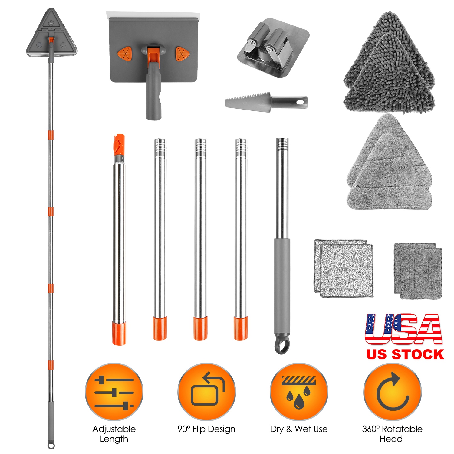 Featuring a 360° rotatable head, our baseboard & wall cleaning mop effortlessly reaches corners and hard-to-reach areas, ensuring no dust or dirt goes unnoticed. Constructed of rustproof stainless steel rods with 5 easily connectable sections for sturdy assembly. With an extendable length from 81.5in to 33.6in for the square baseboard head and from 78.7in to 30.9in for the triangle wall mop head, this versatile cleaning mop adapts to different heights and surfaces without requiring ladders or excessive bending. Suitable for both dry and wet conditions, indoors and outdoors, this multifunctional cleaning mop is a must-have tool for walls, ceilings, doors, windows, furniture, floors and more.