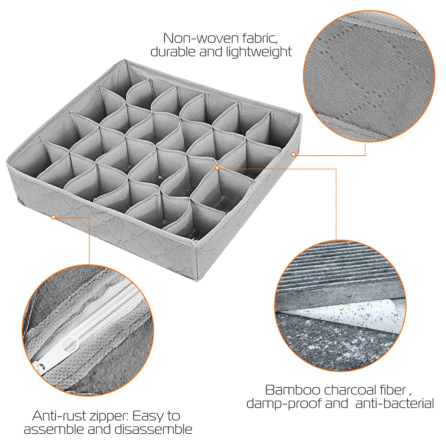 Are you disturbed by disorganized socks, bras and other small items? Do you want to make your items in place and easy to find? Would you want to make full use of a small space and make your home tidy? If yes, our sock organizer box adopts non-woven fabric and bamboo charcoal fiber, damp-proof, antibacterial and smell removal. Featured with collapsible and multiple sizes, can be adjusted to various cells and fit your needs. Easy to assemble and disassemble. An optimal collection of socks, ties, bras, scarves and other small items. Widely placed at cabinet, drawer, closet, nursery and children's bedrooms, dormitory rooms, RVs, cabins and tiny homes. Perfect for small space living