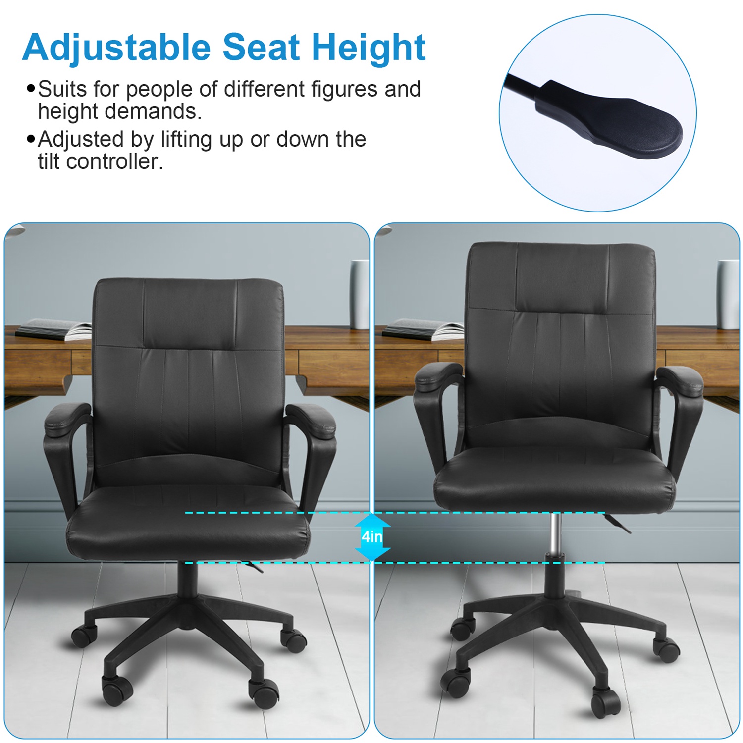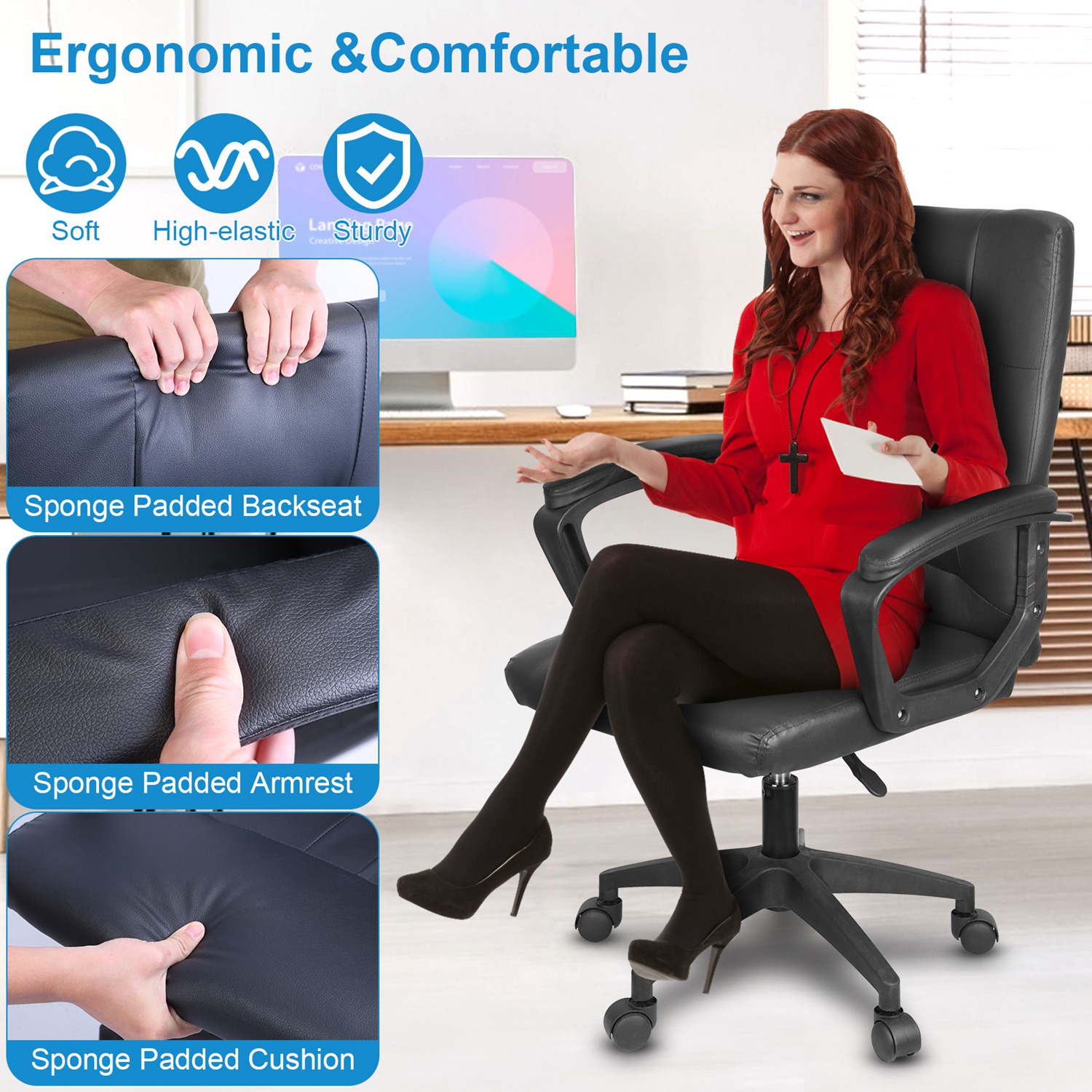 Come with high-elastic sponge cushion seat and ergonomic curved backrest, our office chair is super soft and high-elastic for maximum comfort. 4in Adjustable seat height and 360° swivel design allow you to adjust to the most comfortable height to sit or rest on it. You can also move it to anywhere easily with 5 smooth rolling casters. Great to use it as an ergonomic office chair, gaming chair, home desk chair, etc..
