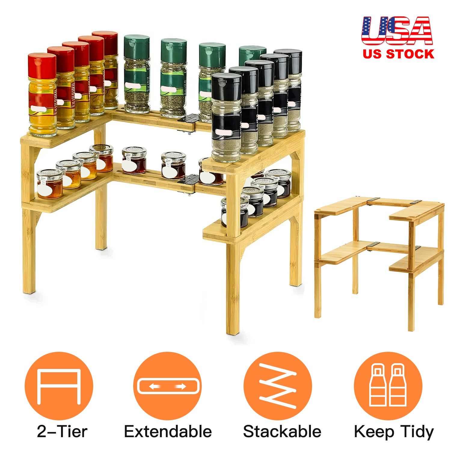 Use this 2-tier bamboo spice rack to store the food cans, beverage cans and spice bottle in cabinets or desktops to keep your cabinets clean and organized! Its extendable and stackable design make it store your spice bottle with the minimum space and fit more kinds of cabinets. Bamboo material with smooth coating surface ensures durability, long-term use and easy wipe cleaning. Just take it home and use it to turn a mess of spices into an organized masterpiece!