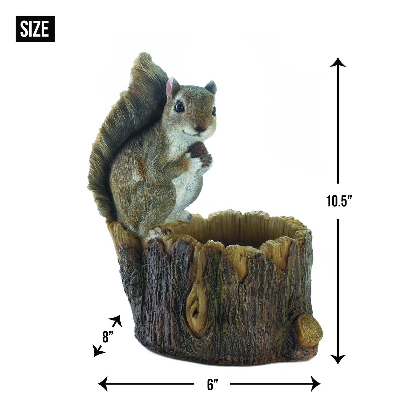 • This friendly squirrel is ready to share a meal with the wildlife in your yard! Fill the hollow tree trunk with feed and delight as the birds, squirrels, and other creatures flock to him.