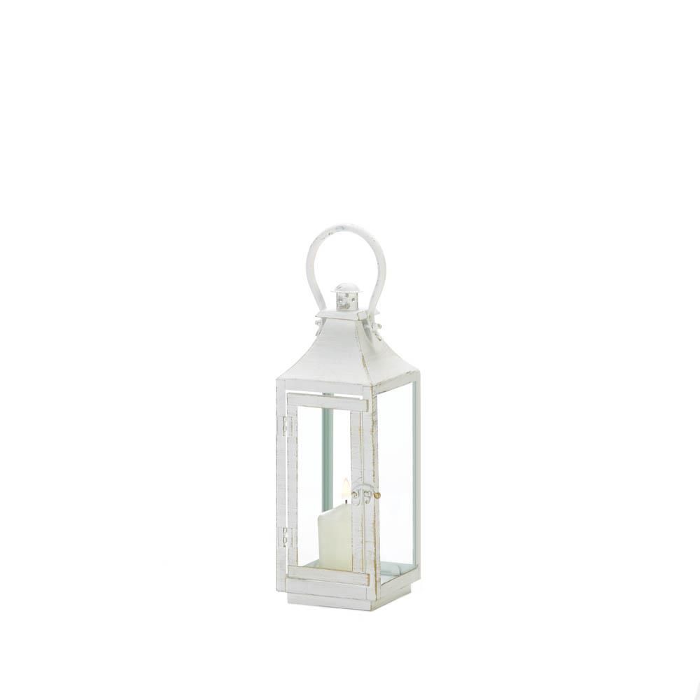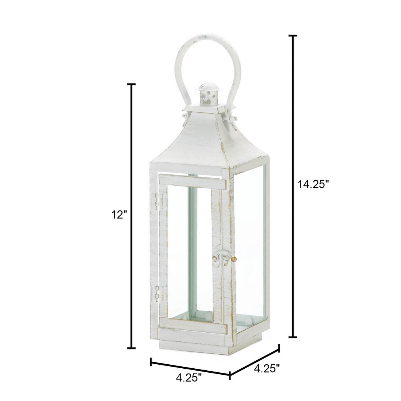 • The Simply White lantern offers a clean silhouette and bright white finish for a modern update on the traditional lantern design. The decorative lantern is made with an iron frame and glass window panes and suitable for both indoor and outdoor settings. Place a flameless candle inside the lantern and hang it under a covered patio or on top of your console table for a charming candlelight display.