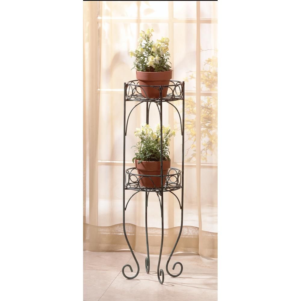 • Lacy scrolls in a verdigris-style finish comprise this two-tier plant stand. A graceful addition for indoors or out with shelves securely holding two of your favorite plants!