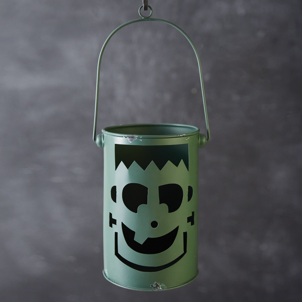 Our Frankie isn't frightful! Illuminate the steps of a porch on a ghoulish Halloween night with his cheerful face. Simply place a candle inside to bring him to life. Item is made of metal and is 14''H with handle extended.