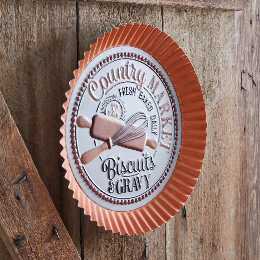 You know that you're in the country when you are being served the staple of biscuits and gravy. This fun bottle cap sign is a must-have for a farmhouse kitchen. Sign is made of metal. To hang, use its triangle hanger.